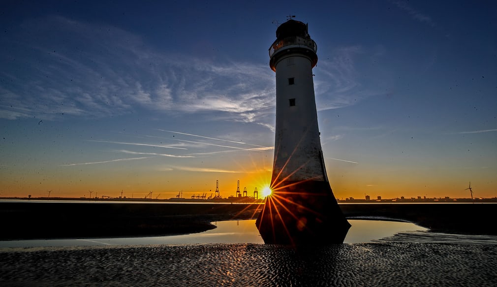 Merseyside, Regno Unito Il sole sorge dietro il faro sulla spiaggia di New Brighton, nella foto di Wirral: Peter Byrne/PA